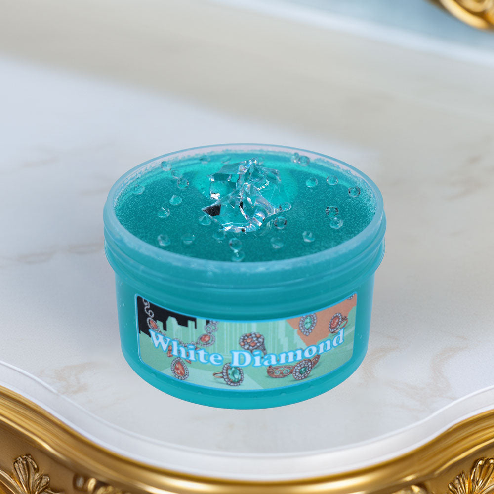 Dive into luxury with this beautiful robin egg blue, white diamond slime. It features a clear/glossy base, smooth texture, a fancy chiffon cake scent, and comes with faux diamond charms that you can add in for additional texture.